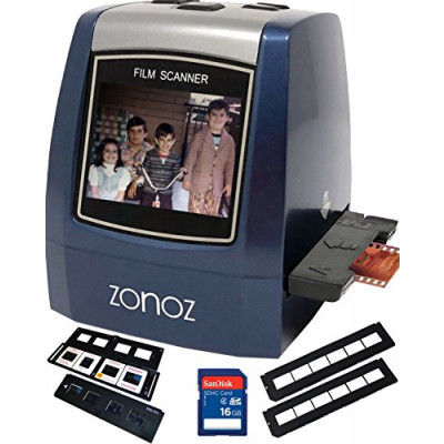 zonoz FS-THREE enhanced high-resolution 35mm, 110 126 negative film & slide scanner and Super 8 film w/ 2.4" Color LCD - no computer or software required to operate. Converts your Negatives & Slides to 22-Megapixel Digital Images. Built-In Software Interpolation Can Improve Quality to 22 Megapixels. Stand-Alone, One-Button Operation: Saves Scans to Internal Memory or INCLUDED 16GB SD/SDHC Memory Card (Supports up to 32GB SD Memory Card). Video Out for TV Connection (Cable Included); Mac & PC Compatible. With the zonoz FS-THREE film scanner, you can easily convert all your old film into digital images. With intuitive controls. Simply plug your FS-THREE into an AC outlet or USB port & scan your film negatives or slides. The zonoz FS-THREE is the perfect device to scan and organize your old films or slides. This scanner houses an incredible image sensor that converts every detail and color contained in your films and slides. With our unique and easy to use built-in software, you can also increase your scanning quality to an amazing 22 megapixels. Within seconds, the image scanner will scan, convert and save your old films and slides. You can now preserve your memories forever. With our zonoz FS-THREE film scanner, you won't need anything else to get started. Using the film scanner is very easy with our intuitive design. Just load the film or slide onto the negatives or positives holder, and insert into place. Once the image appears, press "Scan". It is that easy. Your image has been scanned and saved to the FS-THREE's built-in memory. Items can also be saved to an SD card also (16GB SD MEMORY CARD INCLUDED). The zonoz FS-THREE also has some very convenient features like scanning resolution and brightness. You can also flip/mirror images to eliminate some simple loading errors. This amazing and portable film scanner is all you need to convert your old films and slides into permanent memories. Easy to use.(INCLUDED SANDISK 16GB SD MEMORY CARD CAN HOLD OVER 3000 PICTURES)