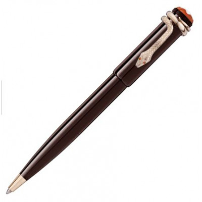 The Rouge et Noir collection celebrates a 110-year-old pioneering tradition with vintage design that is distinctively Montblanc. A redesign inspired by the 1906 pen, it features a tropic brown precious-resin cap and lacquered body with gold-coated fittings. The serpent clip coils around the cap and is set with two glittering garnets as eyes. The finishing touch is the iconic Montblanc snowcap finial in ivory-colored resin. Twist-mechanism ballpoint. Made in Germany. Dimensions: retracted length ~125.5mm, barrel-width ~10mm, cap-width ~11.5mm.