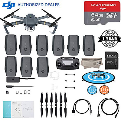 DJI Mavic Pro Quadcopter with Remote Controller, 9 Batteries(1 New Batteries, 8 Open Box Batteries)64GB Micro SD With Adapter, Landing Pad, Microfibre Cloths, With 1-Year Warranty - Gray