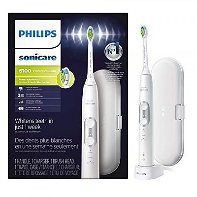 ProtectiveClean 6100 rechargeable electric toothbrush delivers up to 100 percent less stains in just 7 days to whiten your teeth in just 1 week vs a manual toothbrush. It has a pressure sensor that protects your teeth and gums from excess brushing pressure. Brush heads wear out over time. Our brush head replacement reminder tracks how long you have been using your DiamondClean brush head and how hard you have been brushing. It will beep to inform you when to replace your brush head. Customize your own brushing experience with 3 intensity settings and your choice of 3 modes: Clean, White and Gum Care. The easy start feature slowly increases the power of the brush as you get used to the Sonicare experience and the Smartimer encourages a full 2 minutes brushing time as recommended by your Dental Professional. The battery charge indicator light lets you know when it is time recharge; 2 week battery life.