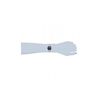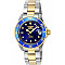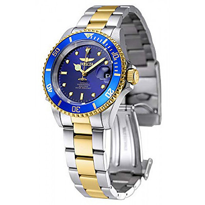 Classic styling and high performance add up to an outstanding sport watch for your land or sea adventures. This two-tone automatic watch, from Invicta's Pro Diver series, places a large round stainless steel case on a robust steel bracelet with gold-plated center links. The electric blue dial is designed for quick and easy read-off, even in low light conditions. It offers three-hand function with luminous hands and markers and a magnified date display at the three o'clock position. The detailed hands, in Mercedes, sword, and breguet-style logo shapes, add a note of distinction. The dial is capped with a resilient mineral crystal and framed by a blue unidirectional rotating steel bezel with goldtone markings and coin edge detailing. This watch is driven by a Japanese automatic movement, which is visible through the see-through skeleton case back. It is rated water resistant to a full 200 meters.