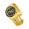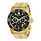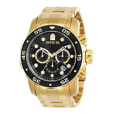 Classic chronograph styling with contemporary features, the Invicta Men's Pro Diver Collection Chronograph 18k Gold-Plated Watch features a brushed and polished 18k gold-plated stainless steel case and a band that closes with a fold-over safety clasp. The stainless steel case provides an ideal foundation for this watch's rotating bezel with minute markers and its attractive black dial. The dial has luminous hands and hour markers, and three subdials at the two, six, and 10 o'clock position. There's also a magnified date window at the four o'clock position to help you keep tabs on your busy schedule. For added style, Invicta included a large crown and two bold buttons on the right-hand side of the case. Other features include precise Swiss quartz movement, a durable flame-fusion crystal, and water resistance to 660 feet (200 meters).