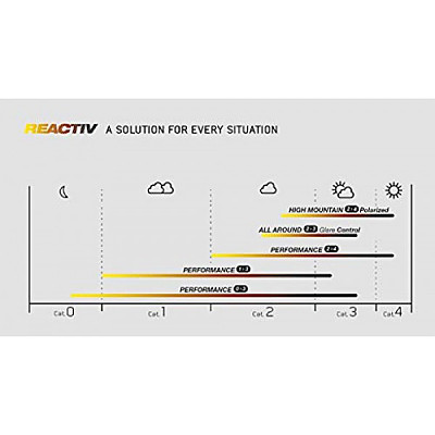 Photochromic lens (cat. 2 to 4 - visible light transmission rate: 5% - 20%), it gets darker or lighter depending on ambient light levels. The lens is also polarized to improve field of vision and eliminate reflective glare. Internal anti-fog coating. Ideal for extreme situations (north face to south face) or high level of sun protection for the eyes.