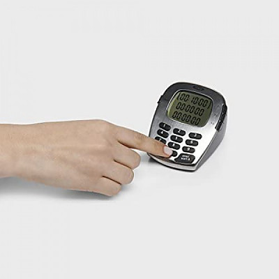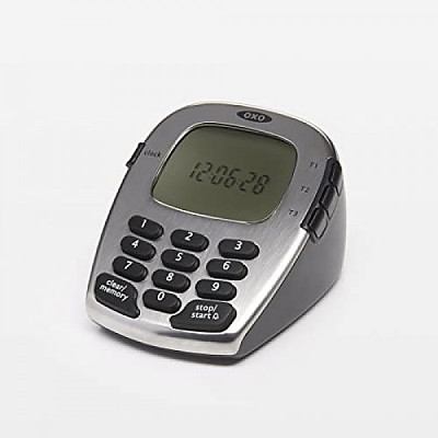 The OXO Good Grips Triple Timer lets you track three events at once or time a long event with secondary intervals. The keypad features soft, easy-press buttons. All three timers can be set up to 100 hours. Each timer has a dedicated area on the easy-to-read LCD, plus a unique alarm sound. To set a timer, press the corresponding button (t1, t2, t3). The LCD automatically converts to clock mode when a timer is not in use. The angled face is easy to see when placed on a countertop or shelf, and the non-slip bottom provides stability while also protecting surfaces. Two AAA batteries included.